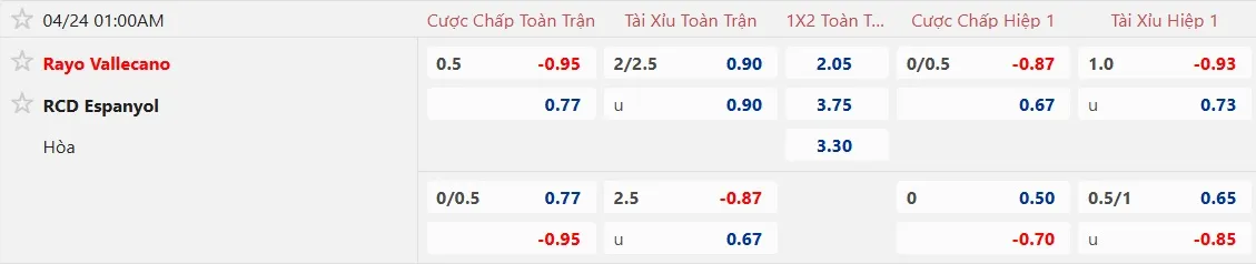 Nhận định soi kèo Vallecano vs Espanyol, 01h00 ngày 24/4 tại giải VĐQG Tây Ban Nha. Phân tích tỷ lệ kèo, dự đoán kết quả Vallecano vs Espanyol từ tỷ lệ châu Âu, châu Á qua các chuyên gia hàng đầu.