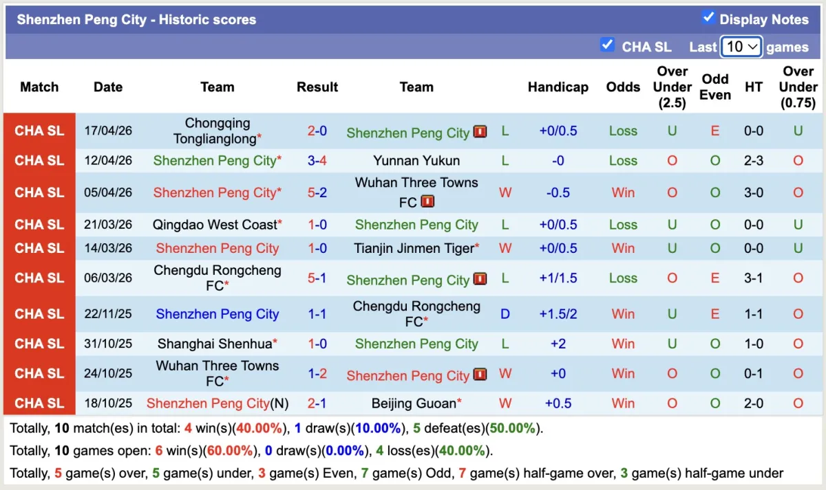 -Thống kê phong độ 10 trận đấu gần nhất của Shenzhen Peng City