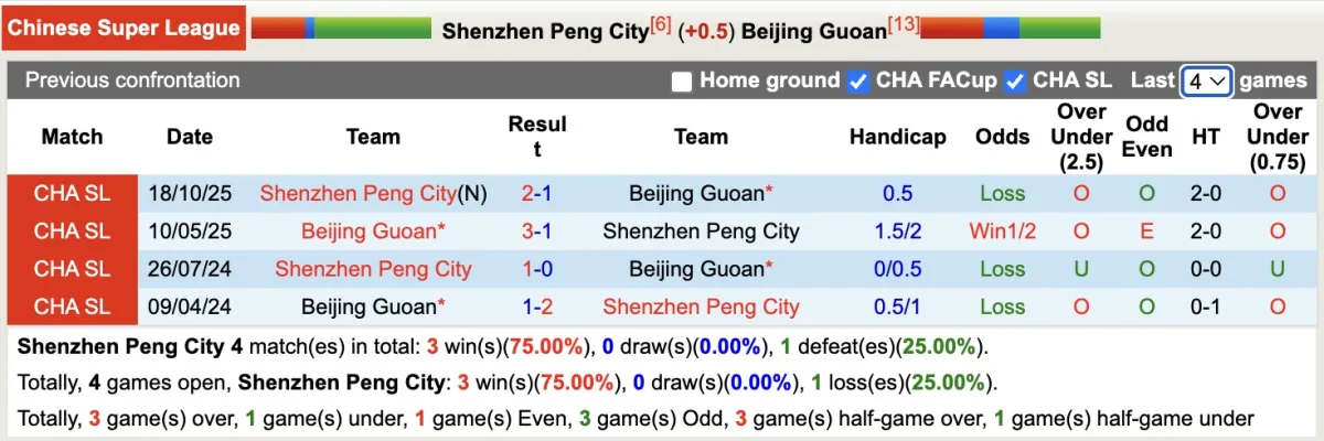 Thống kê phong độ, lịch sử đối đầu của Shenzhen Peng City với Beijing Guoan