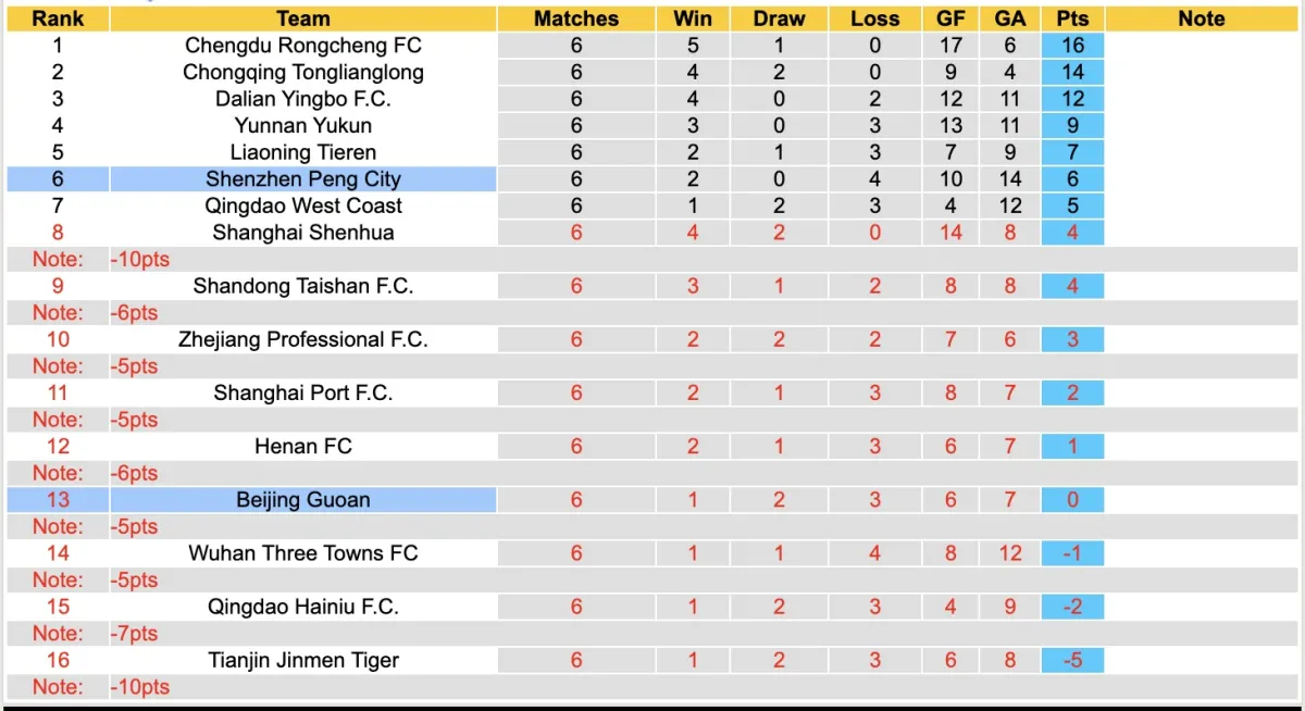 Mặc dù đã có một mùa giải trước khá ấn tượng khi kết thúc tại vị trí thứ 4 trên bảng xếp hạng, nhưng Beijing Guoan vẫn đang phải gánh chịu hậu quả của án phạt. Trong 6 vòng đấu vừa qua, đội bóng này chỉ có được 1 chiến thắng và phải nhận đến 3 thất bại.
