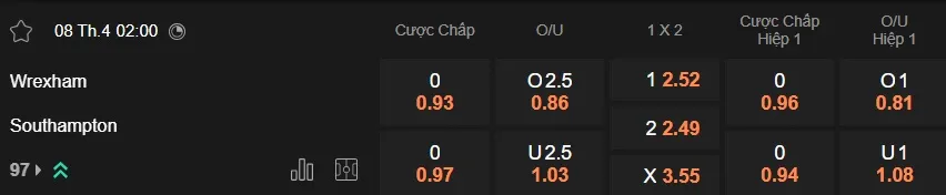 Sàn giao dịch châu Á ghi nhận mức kèo 0:0, tỷ lệ mà ở trận đấu sân nhà gần đây nhất xuất hiện đã chứng kiến thất bại của Wrexham trước Millwall. Với Southampton, đội khách đang có phong độ tuyệt vời, thắng kèo châu Á 7/8 trận vừa qua cùng trận đối đầu gần nhất.