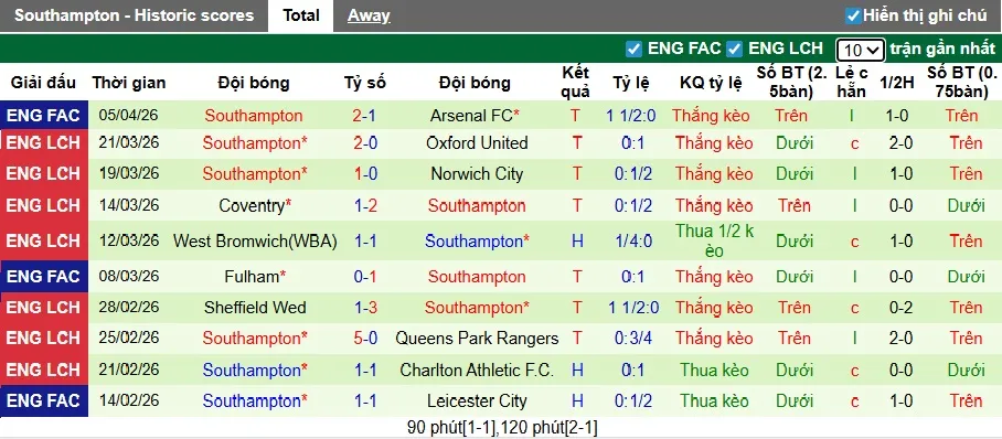 Thống kê phong độ 10 trận đấu gần nhất của Southampton