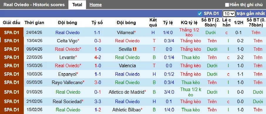 Thống kê phong độ 10 trận đấu gần nhất của Real Oviedo