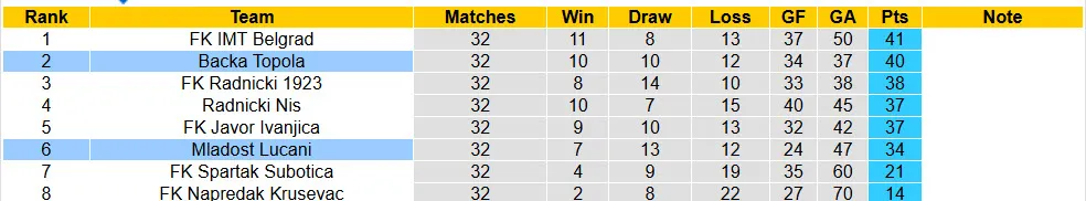 Đêm nay, Backa Topola trở về sân nhà với trận đấu tiếp đón Mladost Lucani và nếu duy trì được đà chiến thắng, đội quân của HLV Darije Kalezic gần như 100% sẽ hoàn thành mục tiêu trụ hạng. Nếu nhìn vào phong độ thực tế của đối thủ cũng như thành tích đối đầu trong năm nay, Backa Topola thừa tự tin hoàn thành mục tiêu 3 điểm. Cần nhớ, họ toàn thắng cả 2 lượt trận chạm mặt Mladost Lucani tại giai đoạn phân lợi. Hiện tại, Mladost Lucani không duy trì được sự tập trung khi thắng có 1 lần ở 16 vòng đấu gần nhất tại giải VĐQG Serbia.
