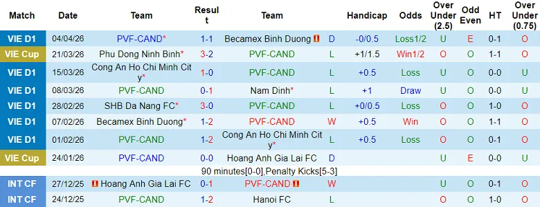 – Thống kê kết quả 10 trận gần nhất của PVF-CAND
