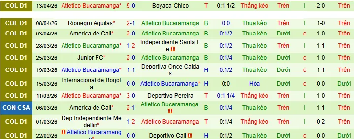 + Bucaramanga thua 5 trong 6 trận vừa qua theo kèo châu Á.