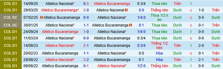 Lịch sử đối đầu Atletico Nacional vs Bucaramanga