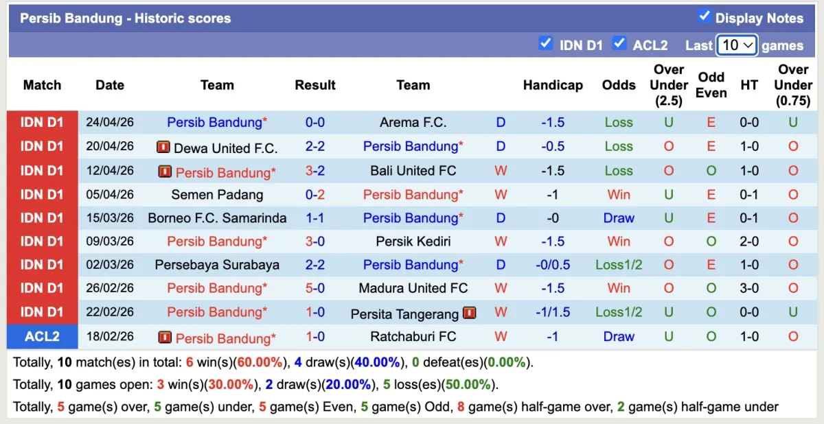 -Thống kê phong độ 10 trận đấu gần nhất của Persib Bandung