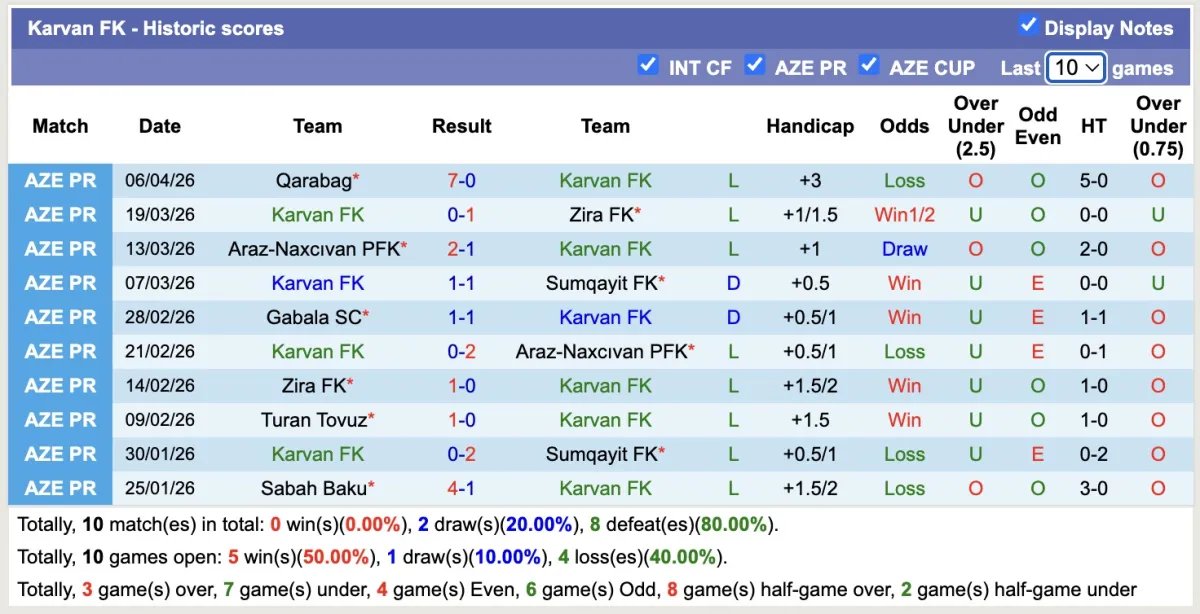 Tính đến thời điểm hiện tại Karvan FK sau 26 vòng đấu tại giải VĐQG Azerbaijan chỉ sở hữu vỏn vẹn 1 chiến thắng trong khi đó nếm đến 20 thất bại. Họ đang đứng bét bảng với 8 điểm và có thể gọi là "Kho điểm của giải" năm nay.