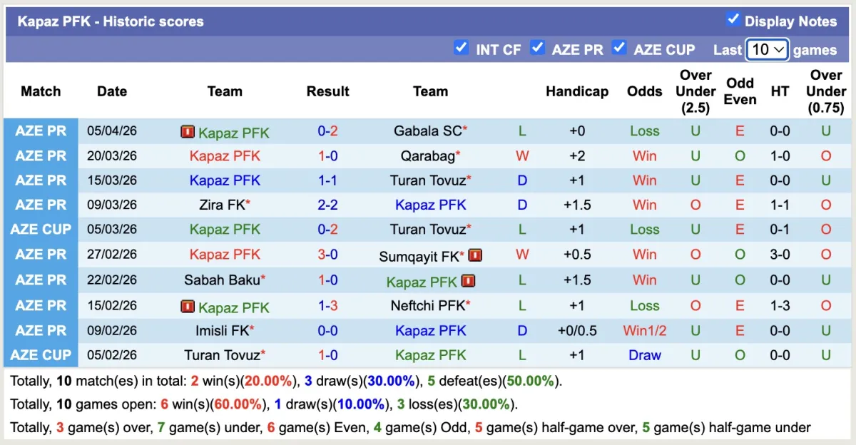 -Thống kê phong độ 10 trận đấu gần nhất của Kapaz PFK