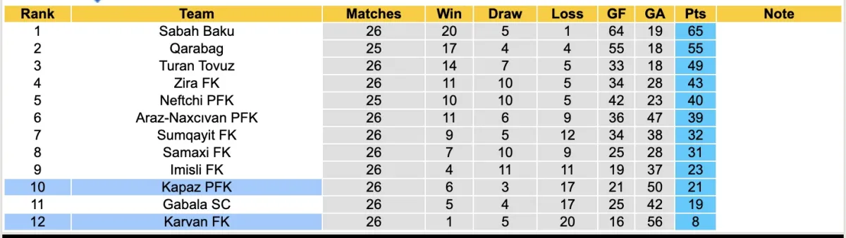 Bảng xếp hạng bóng đá Giải VĐQG Azerbaijan 2026