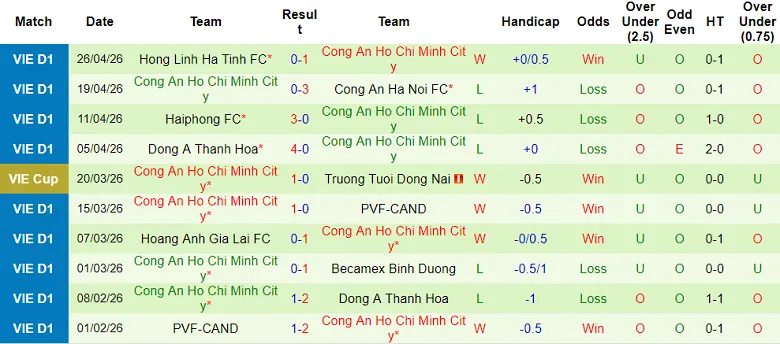 – Thống kê kết quả 10 trận gần nhất của Công an TPHCM
