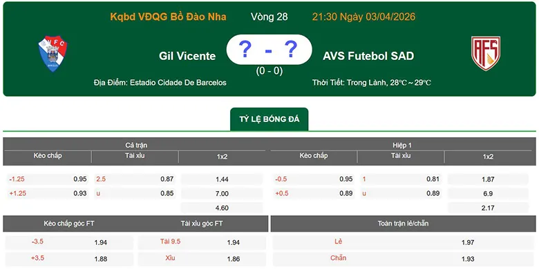 Nhận định, soi kèo Gil Vicente vs AVS Futebol SAD, 21h30 ngày 3/4 – Giải vô địch Bồ Đào Nha. Phân tích tỷ lệ kèo, dự đoán kết quả Gil Vicente đấu với AVS Futebol SAD chuẩn xác từ các chuyên gia hàng đầu BongdaNET.