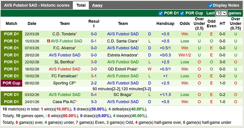 – Thống kê phong độ 10 trận đấu gần nhất của AVS Futebol SAD