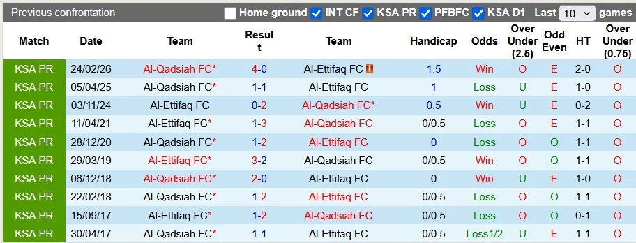 Lịch sử đối đầu Al-Ettifaq vs Al-Qadsiah
