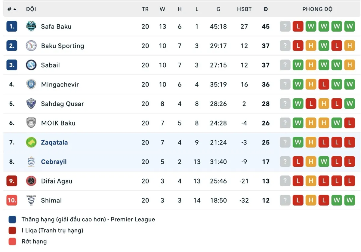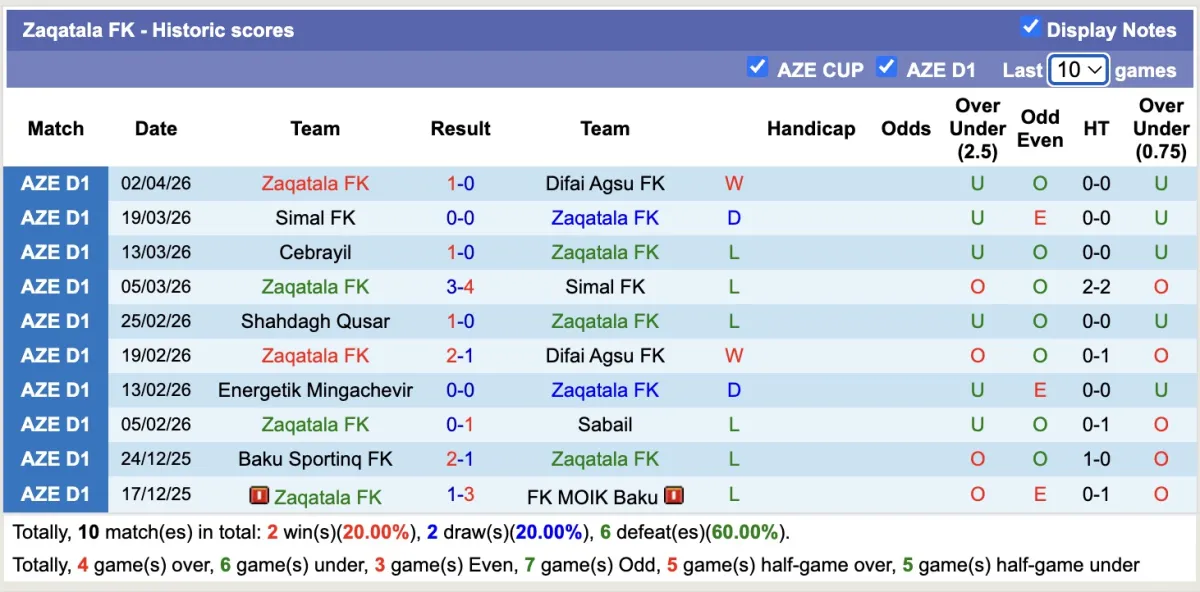 -Thống kê phong độ 10 trận đấu gần nhất của Zaqatala