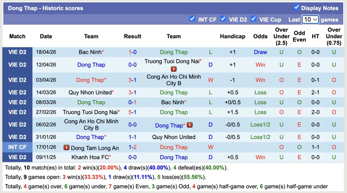 -Thống kê phong độ 10 trận đấu gần nhất của Đồng Tháp