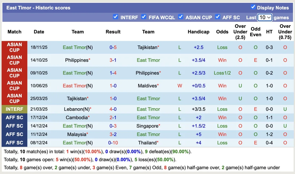 – Thống kê phong độ 10 trận đấu gần nhất của Đông Timor.
