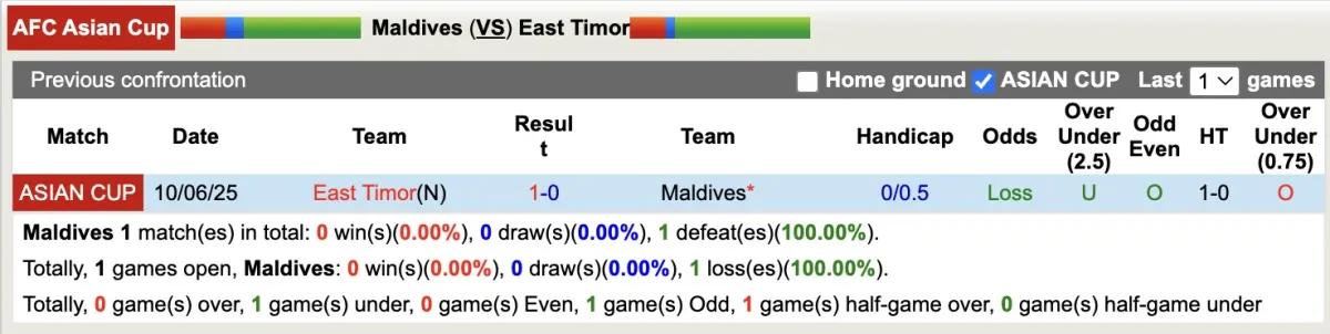 Thống kê phong độ, lịch sử đối đầu của Maldives với Đông Timor