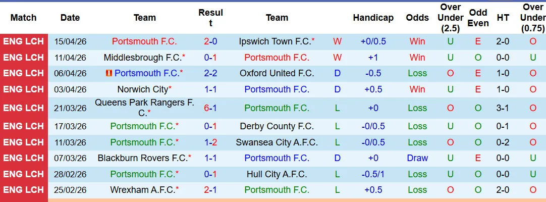 Thống kê phong độ 10 trận đấu gần nhất của Portsmouth