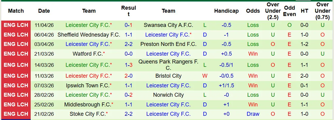 Thống kê phong độ 10 trận đấu gần nhất của Leicester