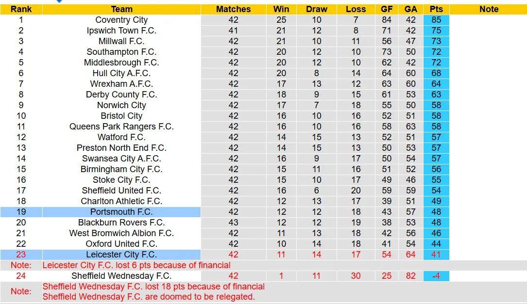 Quay lại với vòng 43 của giải hạng Nhất Anh 2025/26, Leicester đứng ở vị trí thứ 23 trên BXH với chỉ 41 điểm (đã bị trừ 6 điểm) và kém nhóm an toàn tới 5 điểm. Trong bối cảnh mùa giải chỉ còn 4 lượt trận và thi đấu với tinh thần rệu rã, 5 điểm không phải khoảng cách dễ để Leicester san lấp. Cần nhớ, thầy trò HLV Gary Rowett đang chìm trong khủng hoảng khi thắng có 1 lần trong số 16 trận đấu mới đây tại giải hạng Nhất Anh. Cuối tuần này, Leicester có chuyến hành quân tới sân của Portsmouth – đội bóng vẫn còn đó nguy cơ xuống hạng, và nếu không thể giành trọn 3 điểm, Bầy cáo sẽ tiến rất gần với giải hạng 2 Anh. Nhắc lại, Portsmouth là đội bóng có được sự tập trung ở giai đoạn nước rút khi thắng 2 trận đấu mới đây và họ tự tin sẽ đút túi 3 điểm, qua đó hoàn thành mục tiêu trụ hạng.