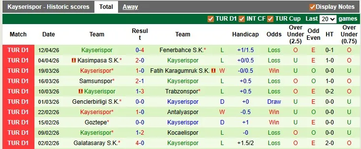 Thống kê phong độ 10 trận đấu gần nhất của Kayserispor.