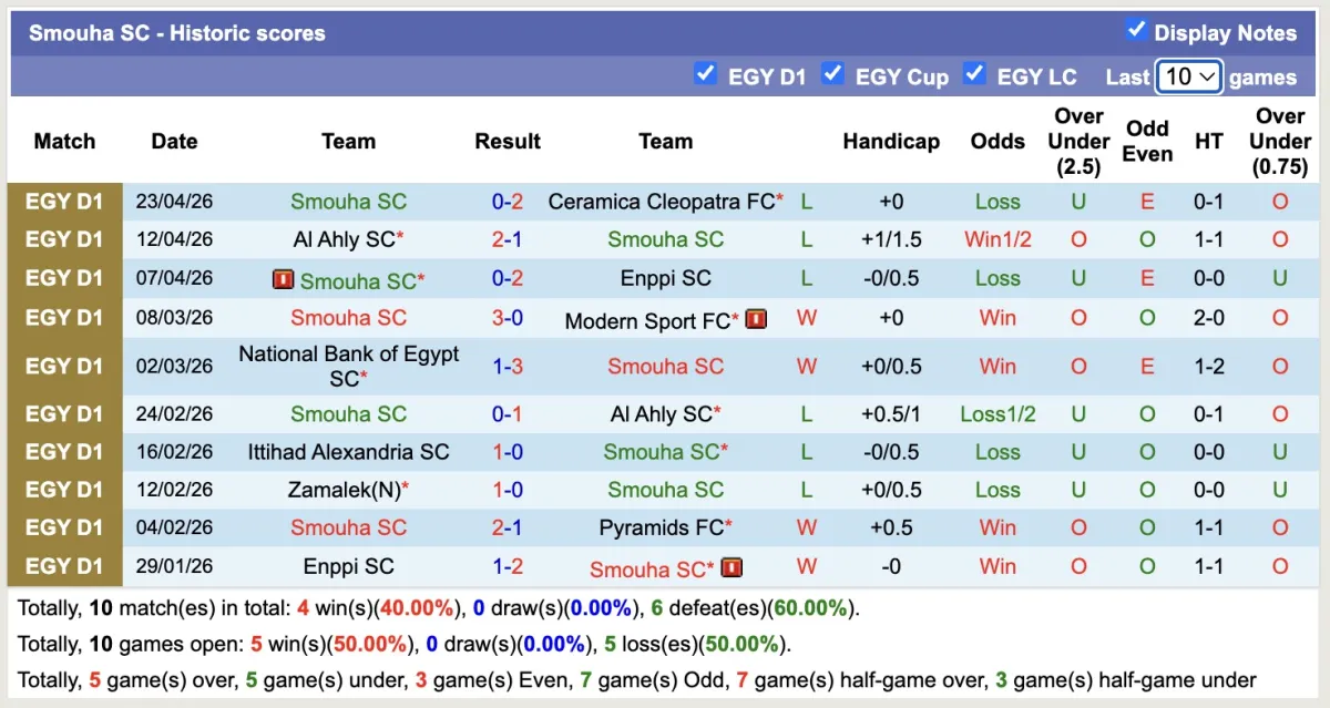 -Thống kê phong độ 10 trận đấu gần nhất của Smouha