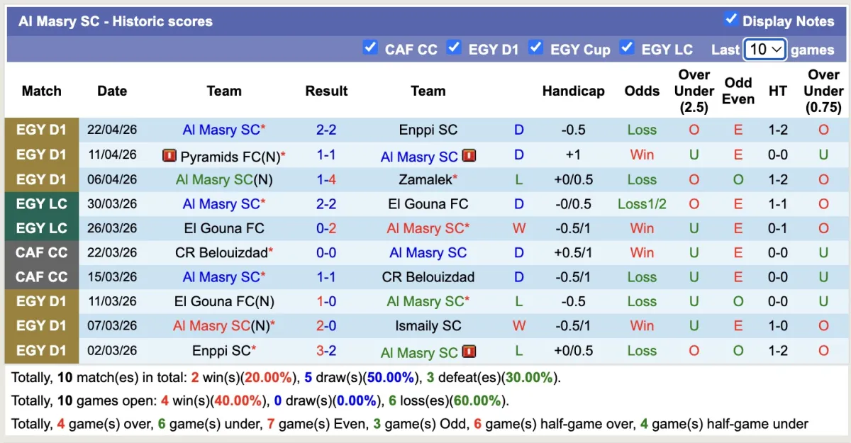 -Thống kê phong độ 10 trận đấu gần nhất của Al Masry