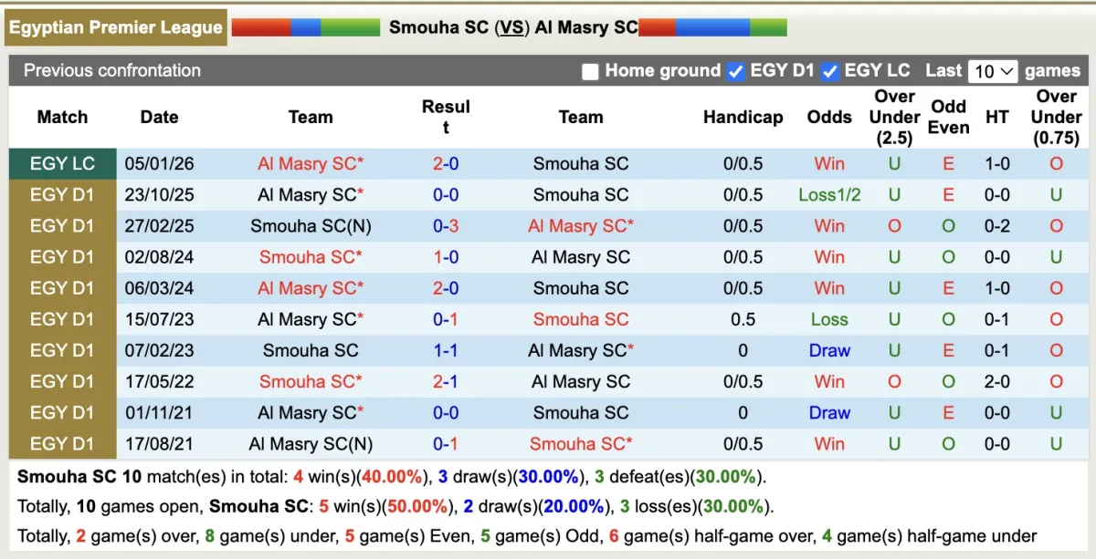 Trong lần đối đầu gần nhất giữa hai câu lạc bộ vào tháng 1 năm 2026 tại mặt trận League Cup. Al Masry đã thắng kèo. Đáng nói 3 lần hành quân xa nhà gần đây đội bóng này đều vượt ải Handicap và 3/4 tẻaanj trên tổ ấm liên tiếp Smouha đều thua kèo, có lẽ đội khách sẽ đáng tin ở kèo châu Á.