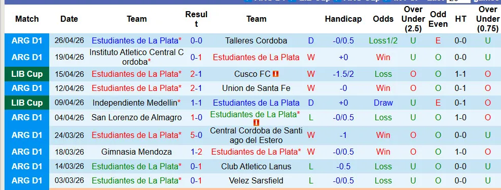 Thống kê phong độ 10 trận đấu gần nhất của Estudiantes de La Plata