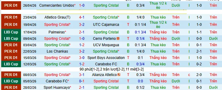 Sporting Cristal cũng không vượt qua mức chấp -0.25 trong 2 trận liên tiếp, điều này ảnh hưởng đến sự tự tin của đội bóng.