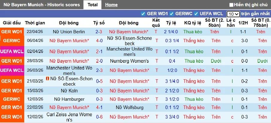Thống kê phong độ 10 trận đấu gần nhất của Nữ Bayern Munich
