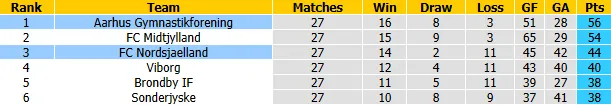 Trong vòng 10 trận đối đầu Nordsjaelland gần đây, Aarhus cũng để mất điểm tới 5 lần (thua 4, hoà 1). Đáng chú ý, 4 lần gần nhất hành quân đến Nordsjaelland, Aarhus bị đánh bại tới 3 lần. Những thông tin cho thấy nhiệm vụ bảo vệ ngôi đầu bảng của Aarhus đang thực sự đứng trước thách thức lớn.