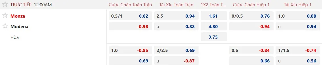 Monza bước vào trận đấu này với thành tích kèo châu Á tương đối ấn tượng, thắng 3/4 trận đấu gần đây. Trên sân nhà, Monza toàn thắng kèo châu Á 5 trận gần nhất. Bên phần sân đối diện, đội khách Modena lại trải qua mạch 5 trận liên tiếp không thắng kèo châu Á với 2 thất bại và 3 trận hòa.