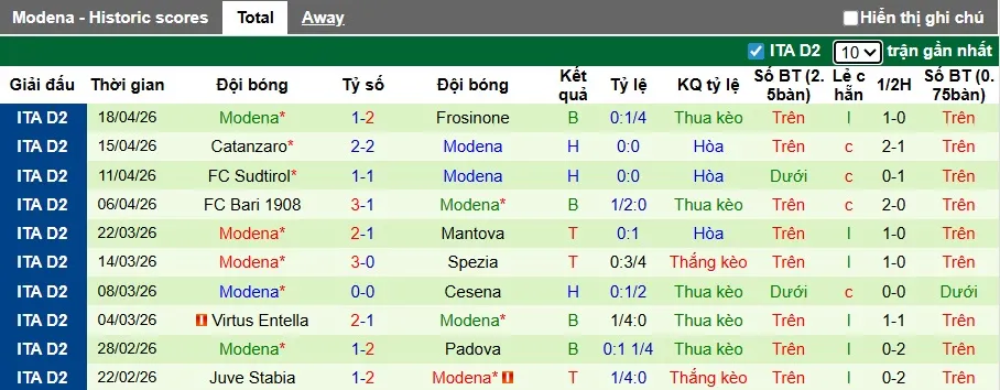 Thống kê phong độ 10 trận đấu gần nhất của Modena