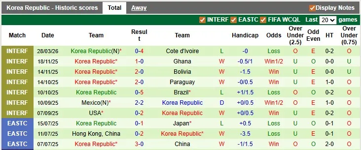 Thống kê phong độ 10 trận đấu gần nhất của Hàn Quốc