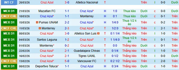 + Cruz Azul thắng 10 hòa 1 thua 4 trong 15 trận gần đây theo kèo châu Á.