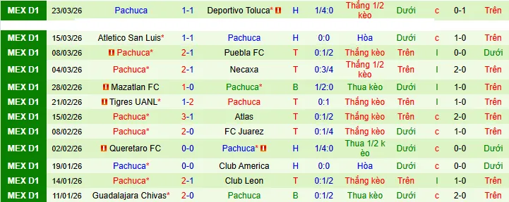 Trong năm trận đấu gần nhất, Pachuca đã giành được hai chiến thắng, hai trận hòa và một trận thua, trung bình ghi được 1,2 bàn và để thủng lưới 1 bàn mỗi trận. Kết quả gần đây nhất của họ bao gồm trận hòa 1-1 với Toluca và trận hòa 1-1 khác với Atlético San Luis, cho thấy xu hướng thi đấu chặt chẽ. Trước đó, họ đã giành được hai chiến thắng liên tiếp với tỷ số 2-1 trước Puebla và Necaxa, chứng tỏ khả năng giành chiến thắng sít sao trong các trận đấu.