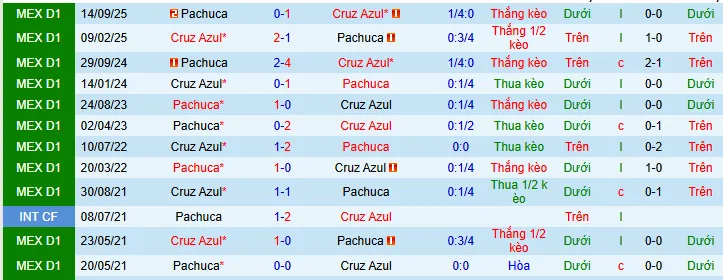+ Cruz Azul thắng cả 3 trận đối đầu gần nhất với Pachuca theo kèo châu Á.