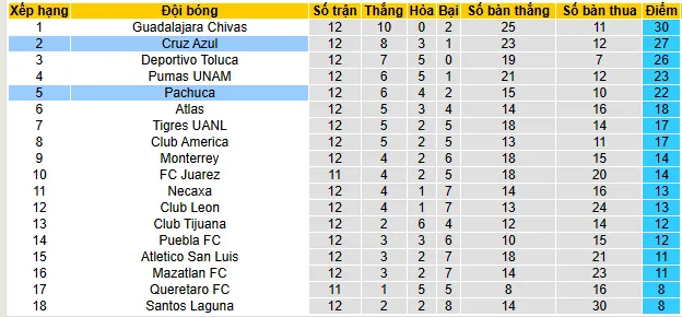 Cruz Azul hiện đang đứng thứ hai trên bảng xếp hạng Liga MX, với 27 điểm sau 8 trận thắng, 3 trận hòa và 1 trận thua. Họ chỉ kém ngôi đầu của Chivas bằng điểm một trận thắng. Hàng công của họ thuộc hàng tốt nhất giải đấu, với 23 bàn thắng và chỉ để thủng lưới 12 lần. Mặc dù trận hòa 1-1 gần đây với Mazatlán đã khiến họ mất vị trí đầu bảng, đội bóng vẫn tiếp tục thể hiện sự ổn định và cân bằng ở mọi tuyến.