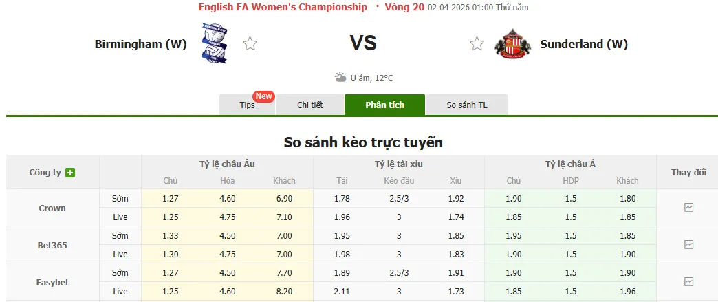 Nhận định soi kèo Nữ Birmingham vs Nữ Sunderland, 01h00 ngày 2/4 tại giải Nữ hạng Nhất Anh. Phân tích tỷ lệ kèo, dự đoán kết quả Nữ Birmingham đấu với Nữ Sunderland từ tỷ lệ châu Âu, châu Á qua các chuyên gia hàng đầu.