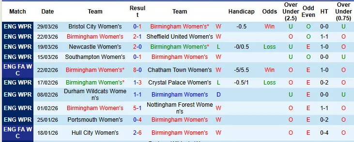 Thống kê phong độ 10 trận đấu gần nhất của Nữ Birmingham