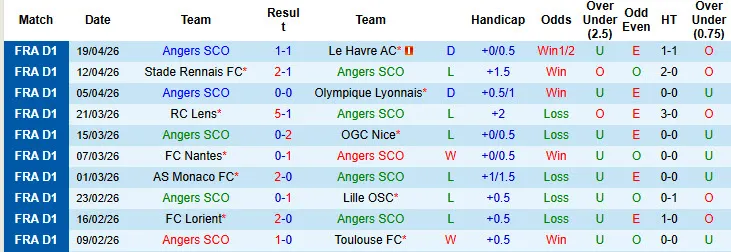 Thống kê phong độ 10 trận đấu gần nhất của Angers