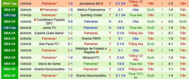 + Palmeiras thắng 11 hòa 4 thua 5 trong 20 trận vừa qua theo kèo châu Á.
