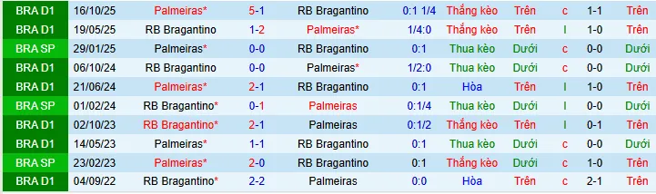+ Trên sân nhà, Bragantino chỉ thắng kèo châu Á 4 hòa 2 nhưng thua 10 trong 16 trận đón tiếp Palmeiras.