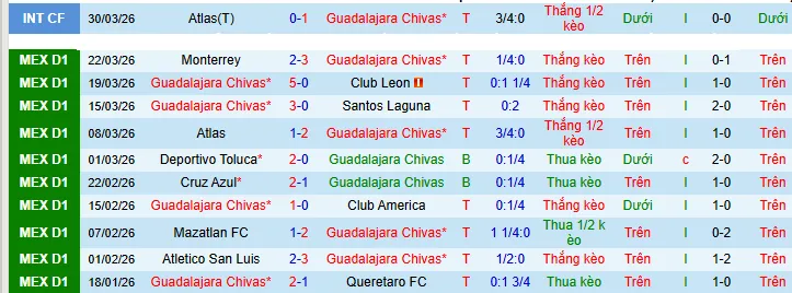 + Guadalajara thắng 8 chỉ thua 2 trong 10 trận gần nhất trên sân nhà theo kèo châu Á.