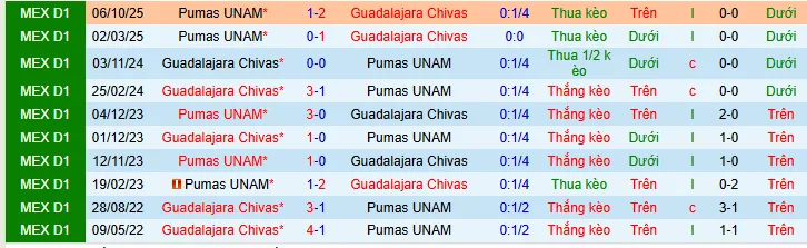 Trong 5 lần gặp nhau gần nhất trên mọi đấu trường, Guadalajara đã chiếm ưu thế tuyệt đối với 3 chiến thắng, trong khi Pumas UNAM chỉ giành được 1 chiến thắng và 1 trận hòa. Trận đấu gần nhất chứng kiến Guadalajara giành chiến thắng với tỷ số 2-1 trên sân khách, càng khẳng định ưu thế của họ trong chuỗi trận đối đầu này.