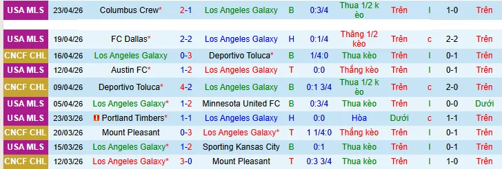 + LA Galaxy thắng 3, hòa 1, thua 7 trong 11 trận gần đây theo kèo châu Á.