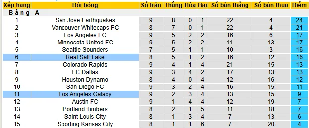 Ngược lại, Real Salt Lake đang có một mùa giải khá thành công khi đứng thứ 6 trên bảng xếp hạng miền Tây với 16 điểm sau 8 trận. Họ có 5 chiến thắng, 1 trận hòa, và 2 trận thua, với 16 bàn thắng và 12 bàn thua. Tuy nhiên, trận đấu gần nhất của họ là một thất bại đáng thất vọng trên sân nhà trước Inter Miami với tỷ số 0-2. Kết quả này là một bước lùi sau chuỗi 4 trận đấu ấn tượng trước đó với 3 chiến thắng và 1 trận hòa.